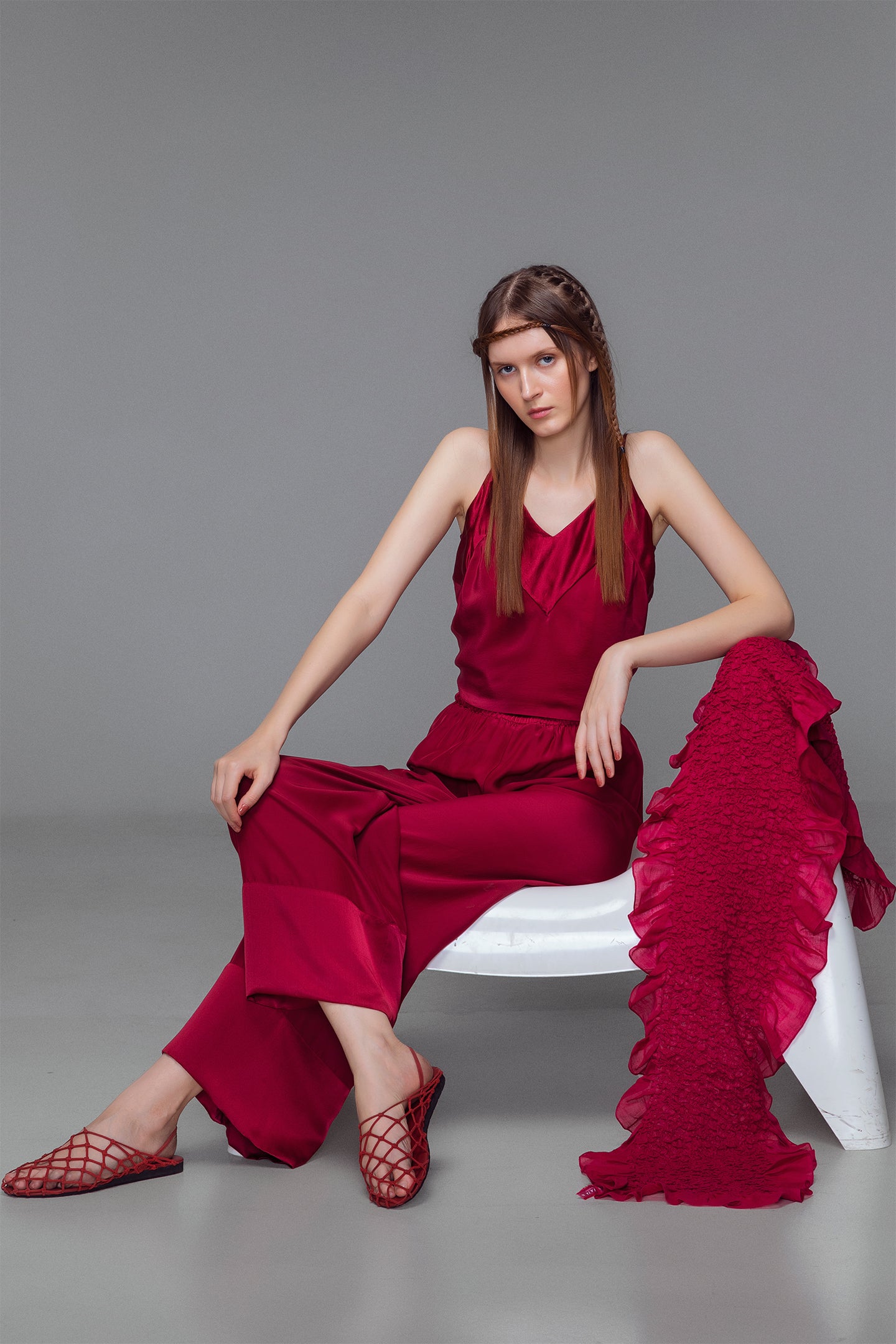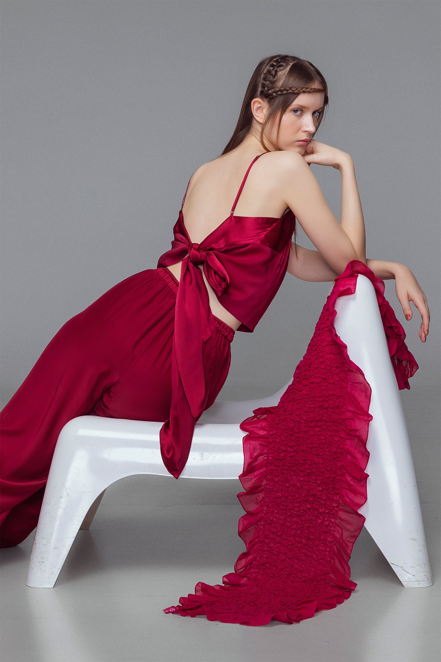 Cinta v-neck wrap around top features ajustable shoulder straps for comfort, and offers a versatility in wrap around styling. Utilizing both the matte and shine sides of the soft silk, the tonal color way eludes to an air of casual elegance.