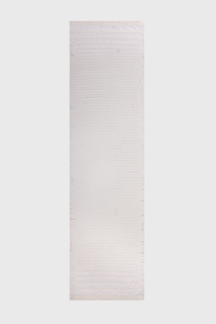 Danke pays tribute to the innovative use of fabric waste to create a treasured piece. The base is of a featherlight sheer Chiffon, that has been accented with individually hand cut appliqué strips of Cotton Muslin gives both a geometric and classic effect. The sizing of the appliqué stripes vary, being wider at the borders then meeting thinly in the middle. Danke is an ode to the brand motto of extraordinary simplicity.