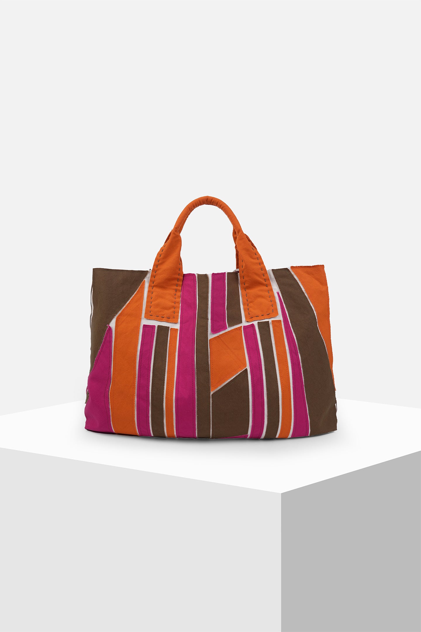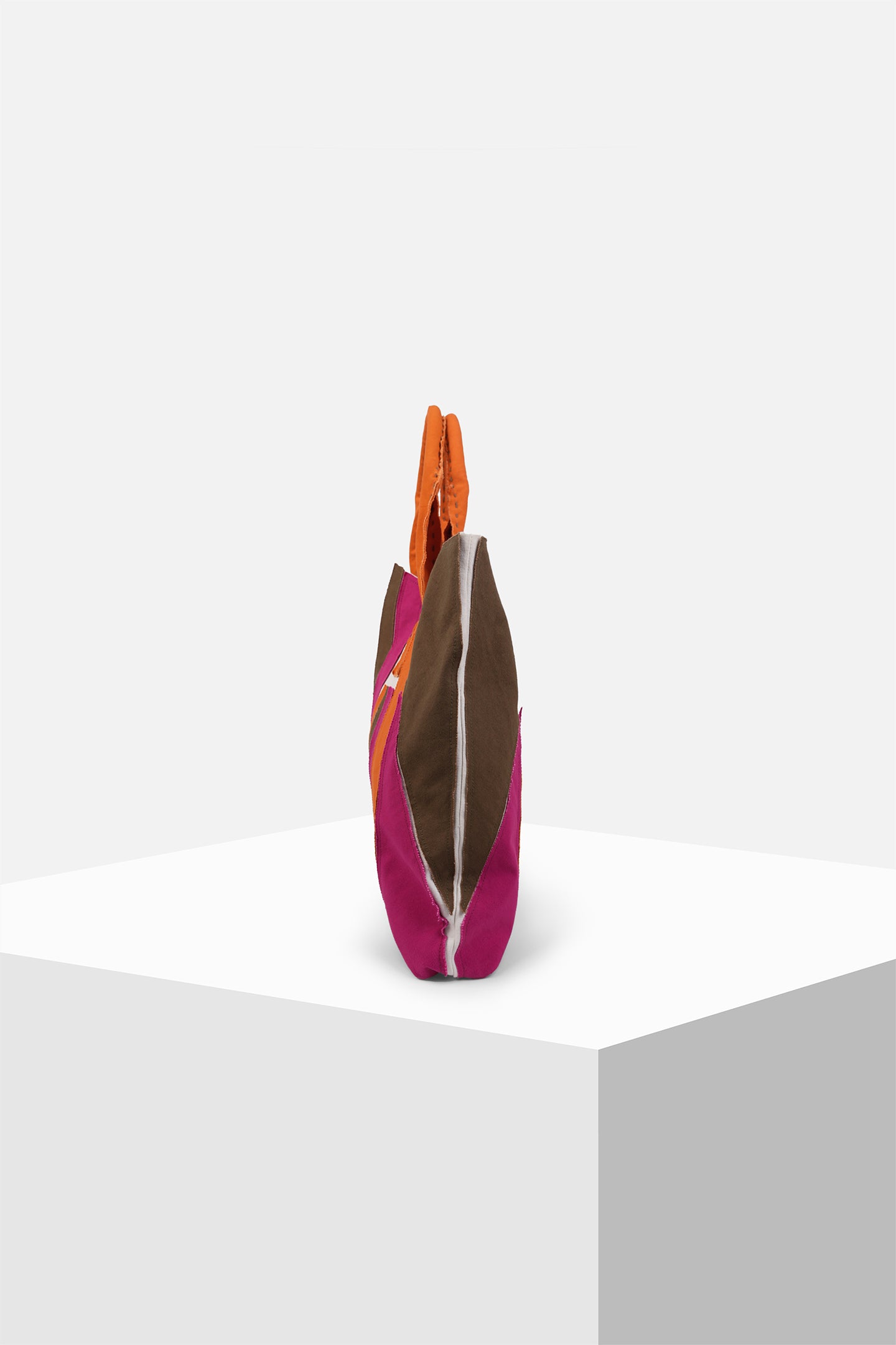 A spacious tote bag crafted from multicolor canvas appliqué in contrasting tones. The piece features contrast hand-stitched detailing on the sturdy canvas handles, a magnetic snap closure, and an internal pocket for essentials. Lined with Lagos motif cotton, it balances artistry and function in a refined everyday carry. Made from 100% cotton.