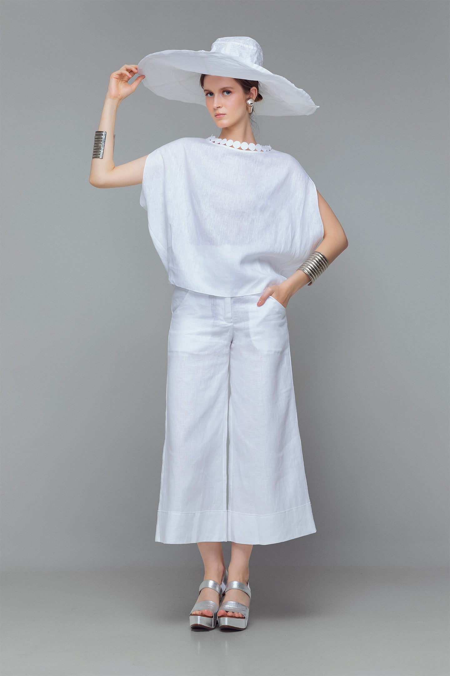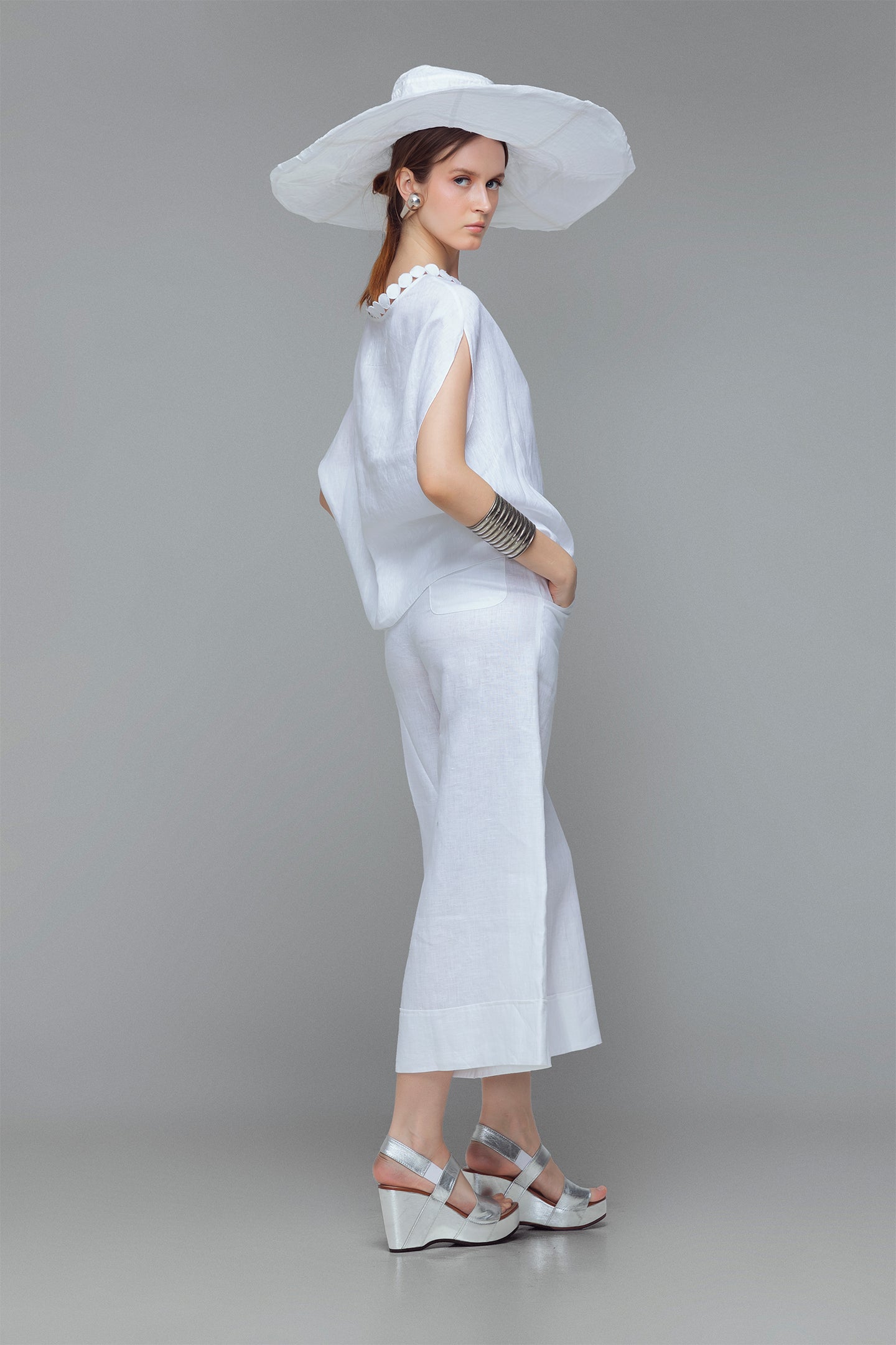 Galway Top embodies a balance of structure and artistry with its rounded silhouette and hand-appliquéd coin detailing along the neckline. Slitted sleeves introduce subtle movement, giving it an effortless grace with a refined touch. Designed for versatility, this piece effortlessly transitions between casual refinement and understated elegance.