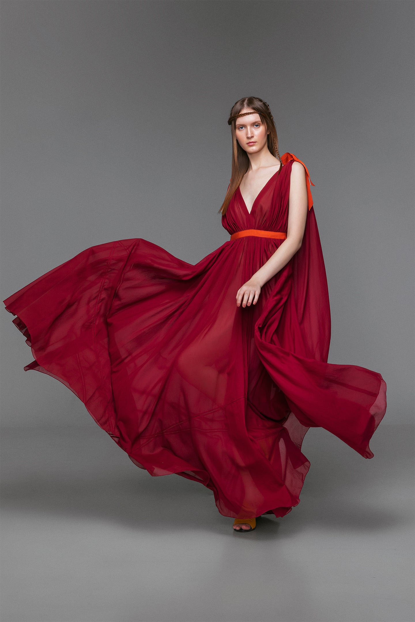 Reminiscent of Goddess-like robes from Ancient civilizations, the Hyma dress boasts five meters of feather light cotton drapery. A waistband tied with ribbon accents provides a classic shape with a flowing elegant train. From garden parties to cocktail soirées, this is the perfect elevated summer look.