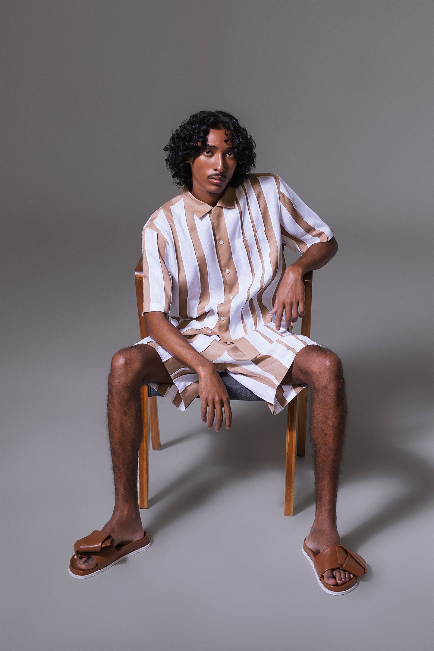 Keian Camp Shirt comes in a relaxed silhouette, highlighted by dual-color stripe patchwork that creates a distinctive crafted look. It features an open notch lapel–like collar with a button-and-loop closure and a clean button-up front without a plamet. Made from pure linen, it offers breathable comfort in warm weather. Versatile and easy to style, Keian pairs seamlessly with shorts for casual days or can be dressed up with trousers for a more polished look.