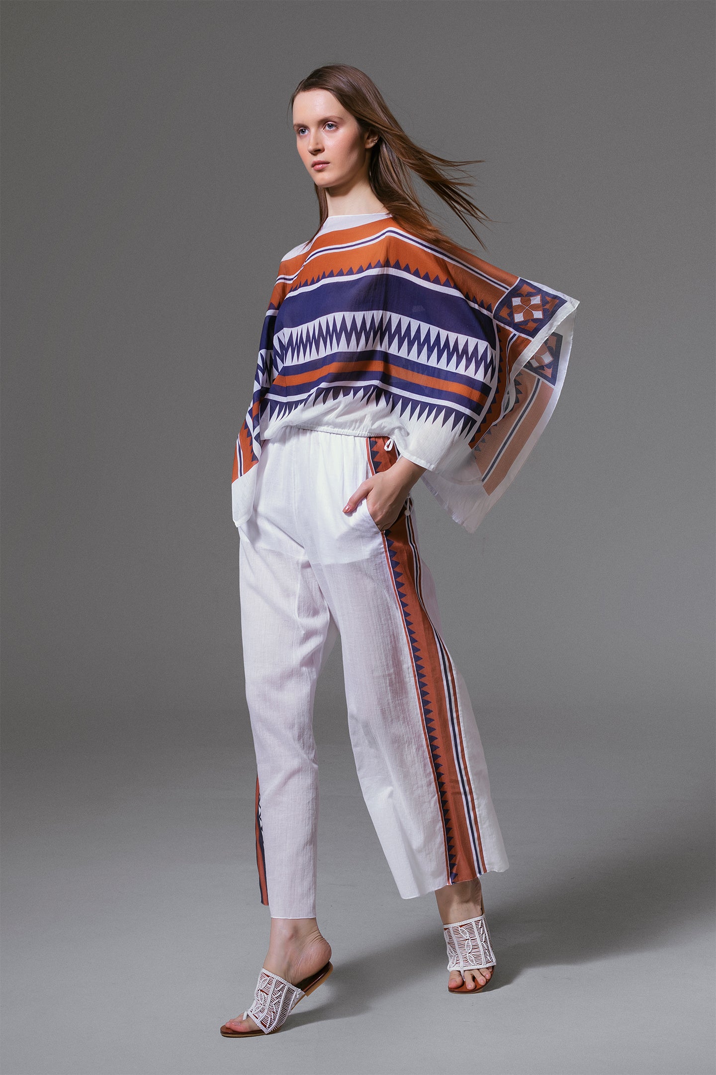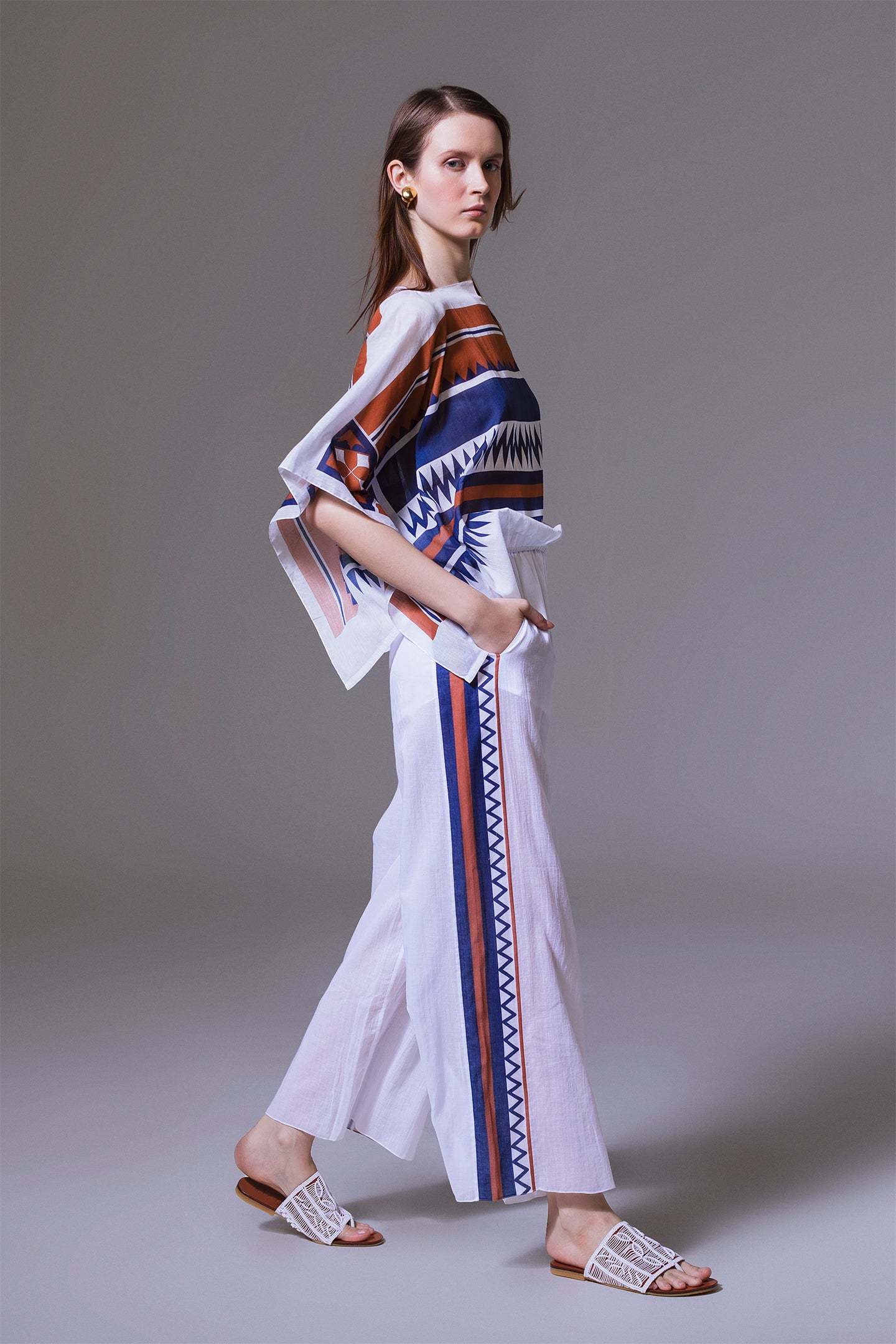 Clean lines meet subtle detailing in these straight-cut cotton pants. The relaxed silhouette is finished with side welt pockets and an inner drawstring at the elasticated waist for added comfort. African-inspired print patches run along both side seams, bringing a graphic accent to the crisp white base. Lightweight and slightly sheer, the design remains breathable with a short inner lining.