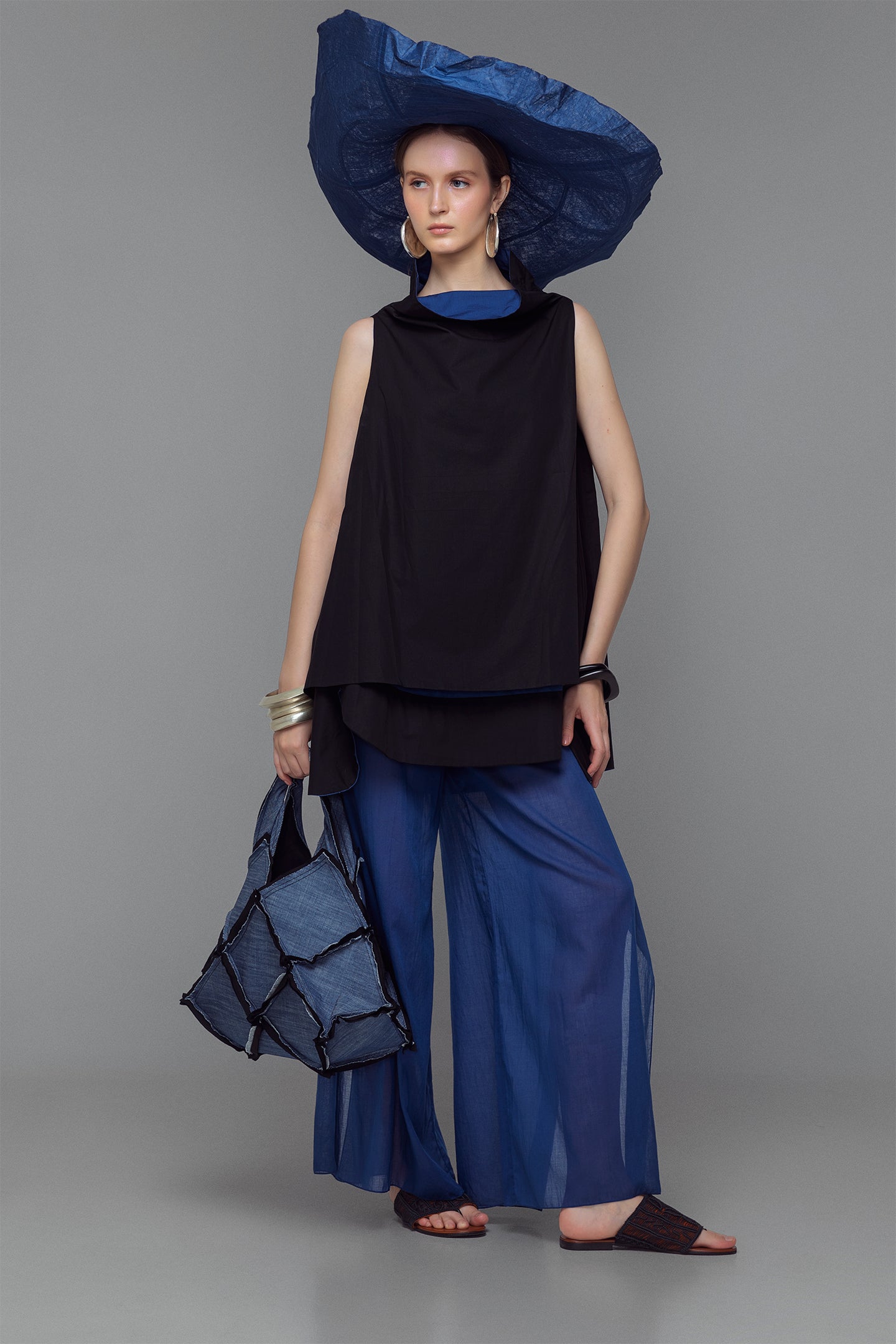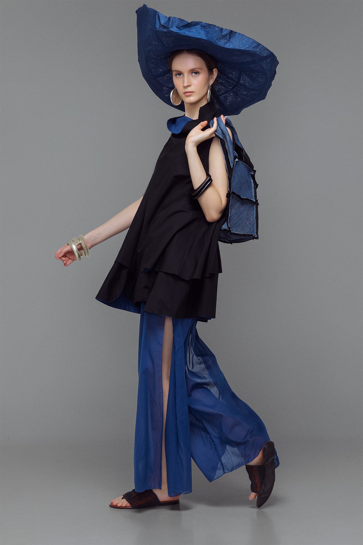 Maelle is a minimalist mini dress featuring a high cowl neck, double layering, and a softly flared hem. Cut from crisp cotton teranova, it can also be worn as a top for varied styling. The all-white version brings a sleek, modern finish, while the tango orange and bordeaux combination offers a graphic color block effect. Light and structured at once, it sets the tone for an effortless, contemporary look.