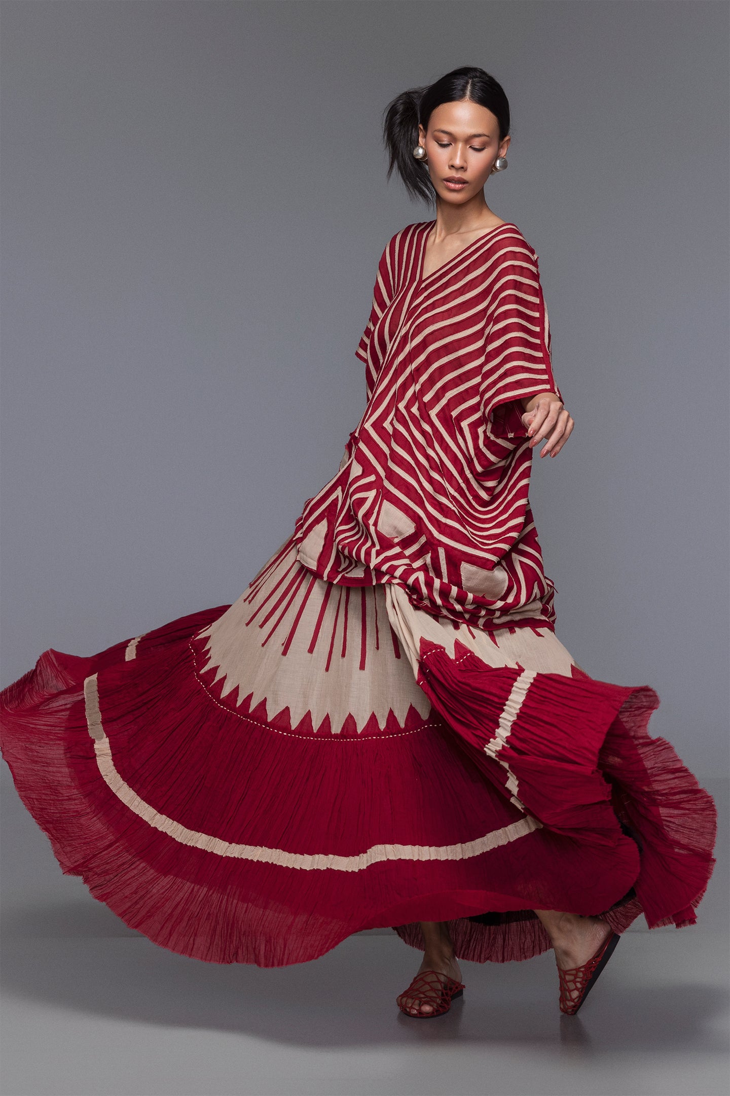 Movement takes center stage in this cotton mousseline maxi skirt, designed with a dramatic crinkled, flowing volume. The black and white contrast is elevated by stripe and triangle-shaped handcut appliqué, creating bold vertical lines that elongate the silhouette. An elasticated waist and side fastening offer comfort and flexibility. Lightly sheer and full of energy, it brings visual rhythm to any look while standing strong as a statement on its own.