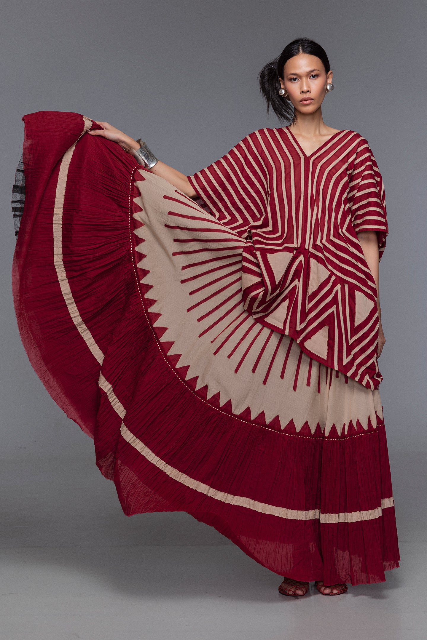Makota Maxi Skirt flows in a dramatic wide silhouette with a fluid drape and airy lightness. Designed with an elasticated waist and side hook-and-eye fastening, it offers comfort in wear. Vertical applique details lend artisanal character, while a crinkled bottom panel enhances movement and dimension. Crafted from lightweight cotton, this skirt elevates your resort style with a timeless look.
