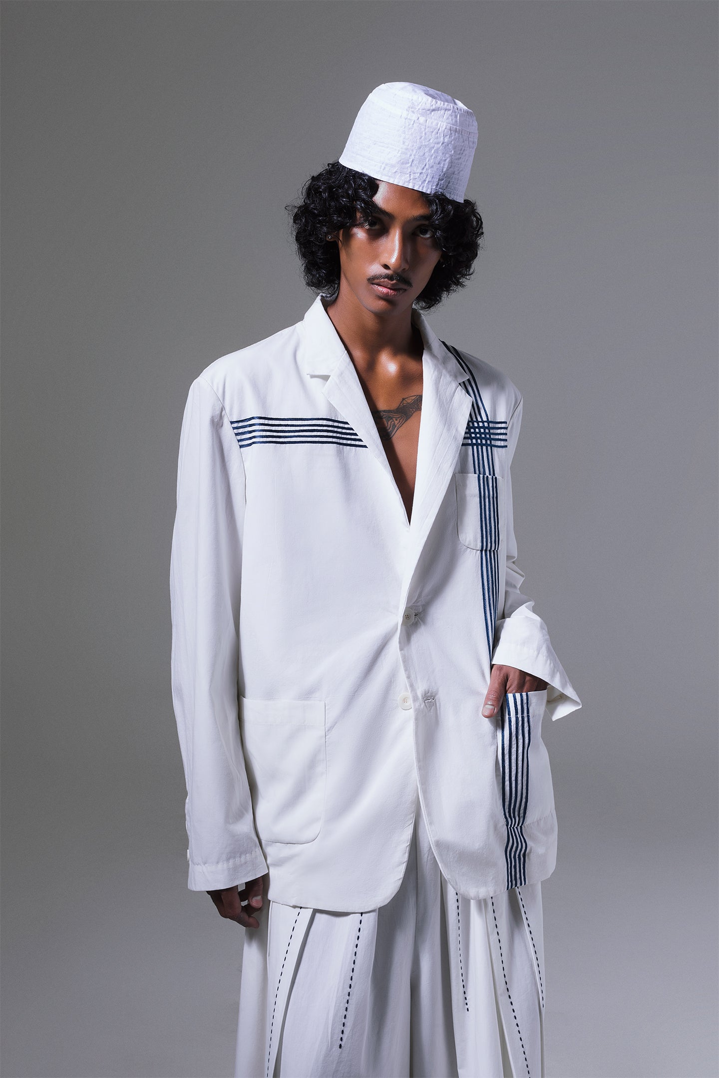 Martica jacket is tailored in an oversized silhouette, defined by five satin ribbon applique stripes that run across the front panel and left back. The single-breasted design closes with two buttons and is finished with three front patch pokets that lend a utilitarian touch. A curved hem and center-back vent introduce movement to the structured shape. Tailored from pure cotton, it offers easy layering for a refined style.