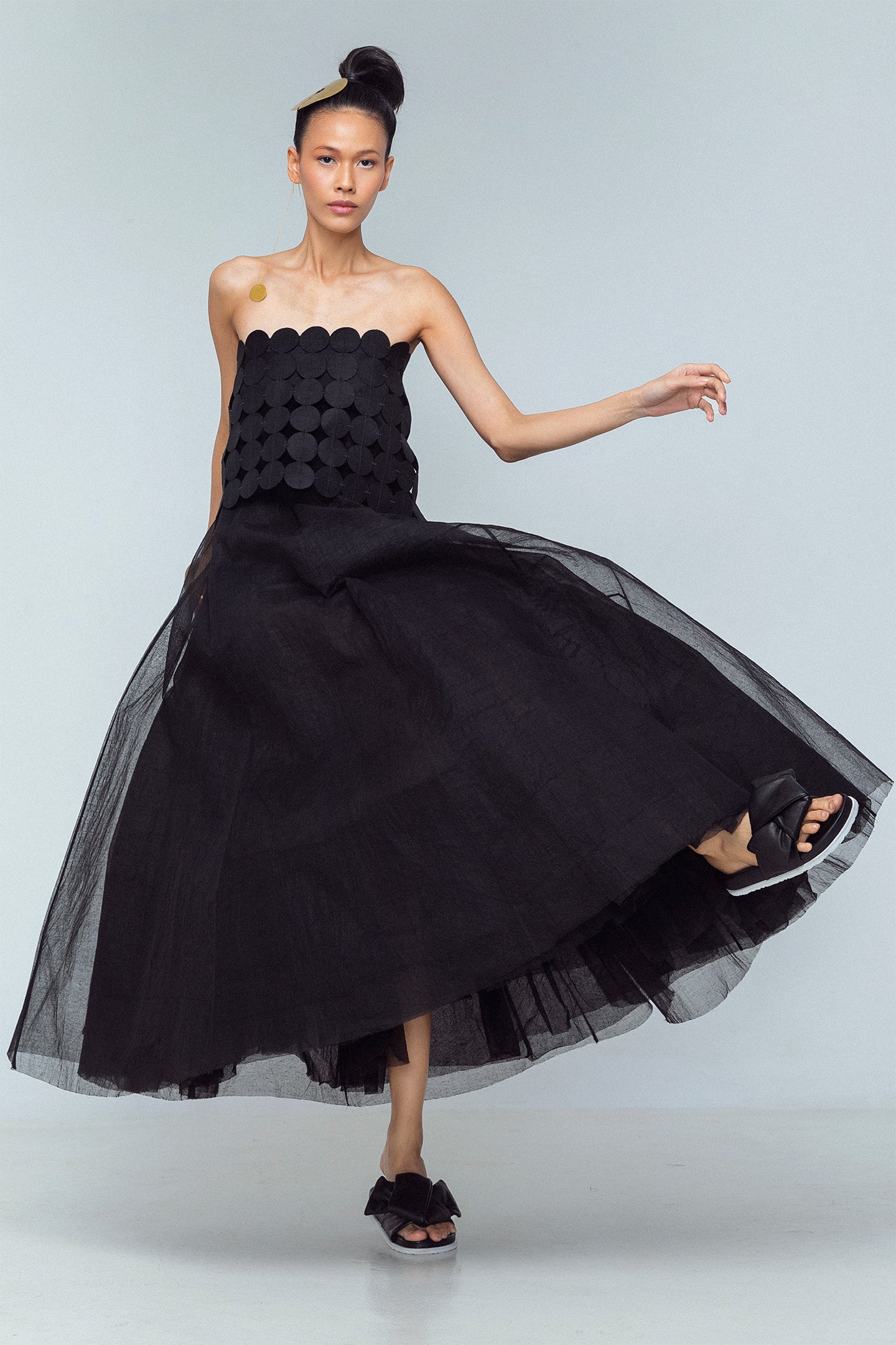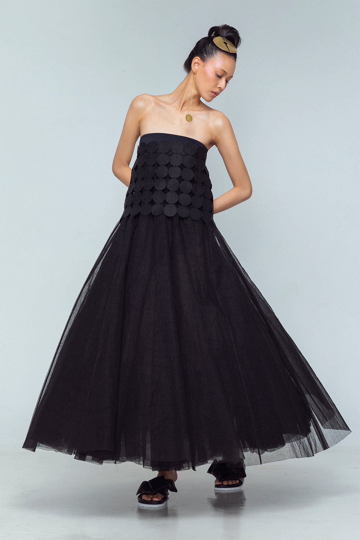 A unique tube-style top crafted from coin-shaped linen appliques, each connected by precise bartam stitching. Designed with ribbon tie closures for an adjustable fit, this versatile piece makes a subtle yet distinctive statement. Made from 100% linen.