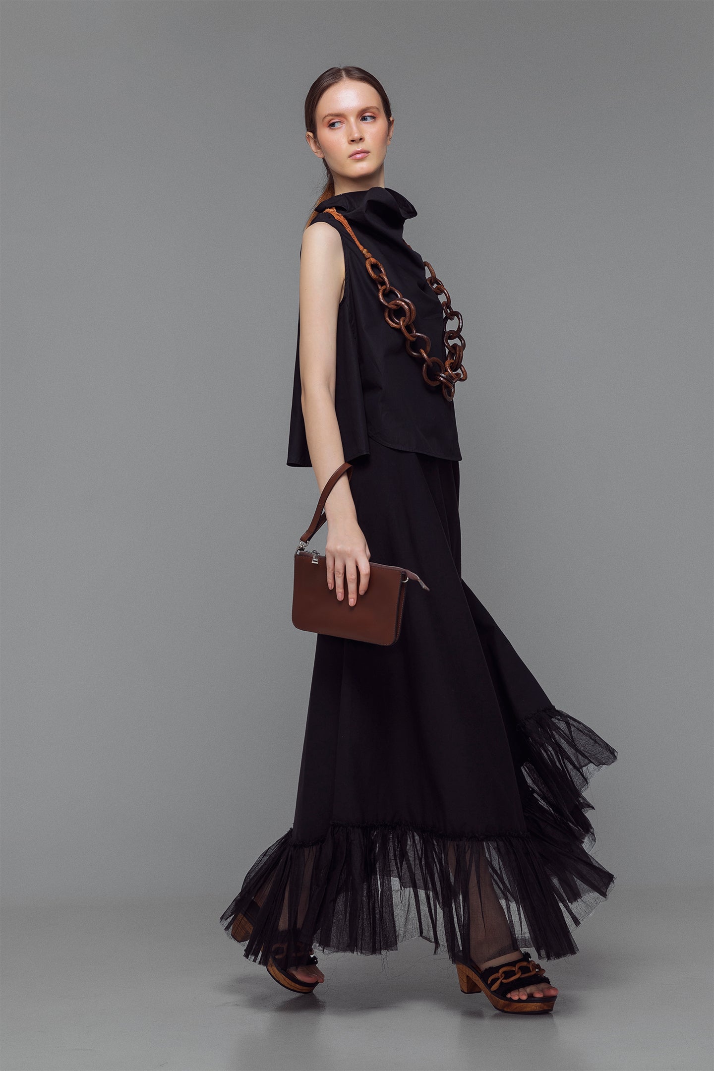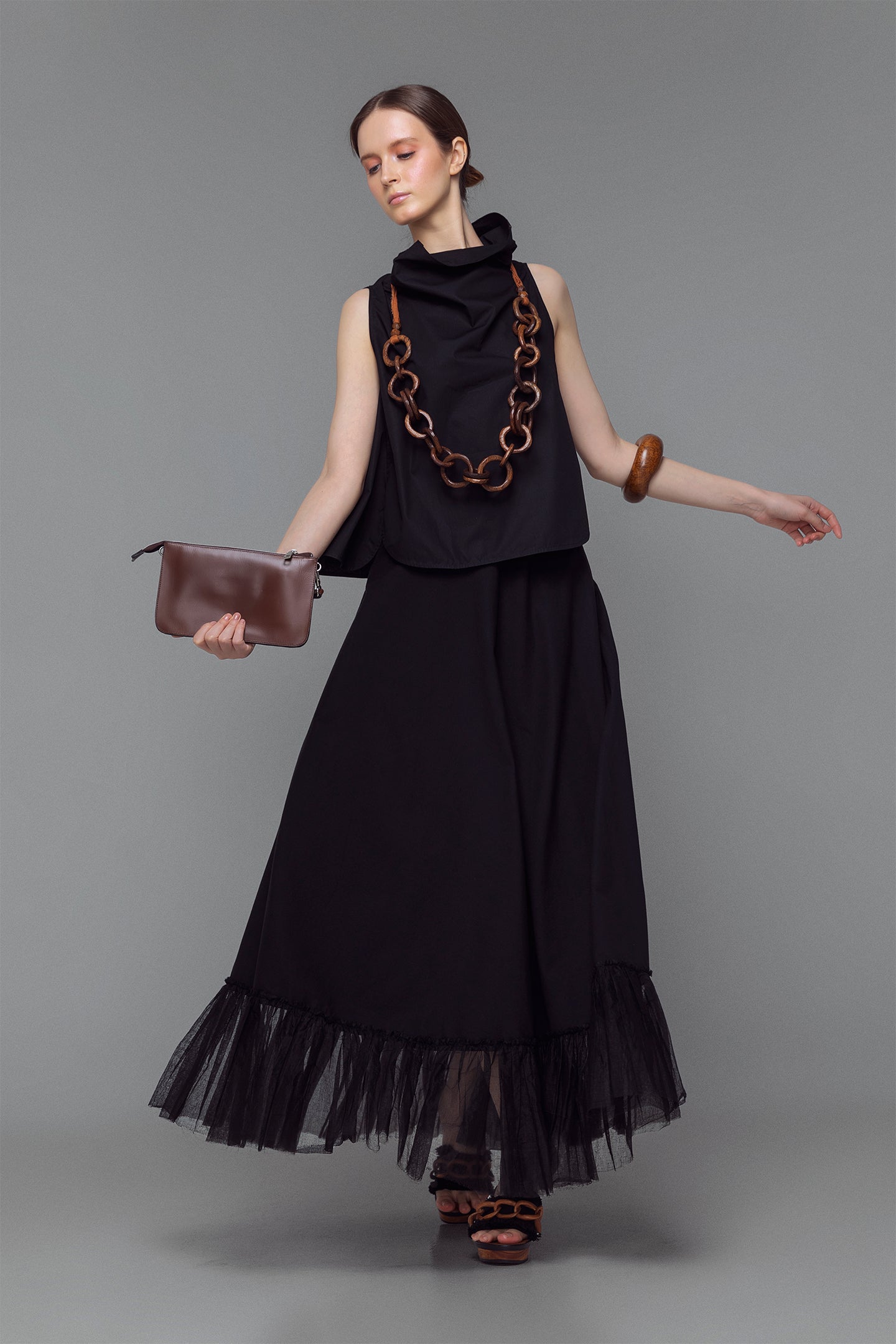Minimal yet refined, this sleeveless top is crafted from lightweight, slightly sheer cotton in a rich Indian red hue. The high cowl neckline adds sculptural volume, creating contrast against the simplicity of the silhouette. Designed for ease and versatility, it’s a warm-weather essential that transitions seamlessly across settings.