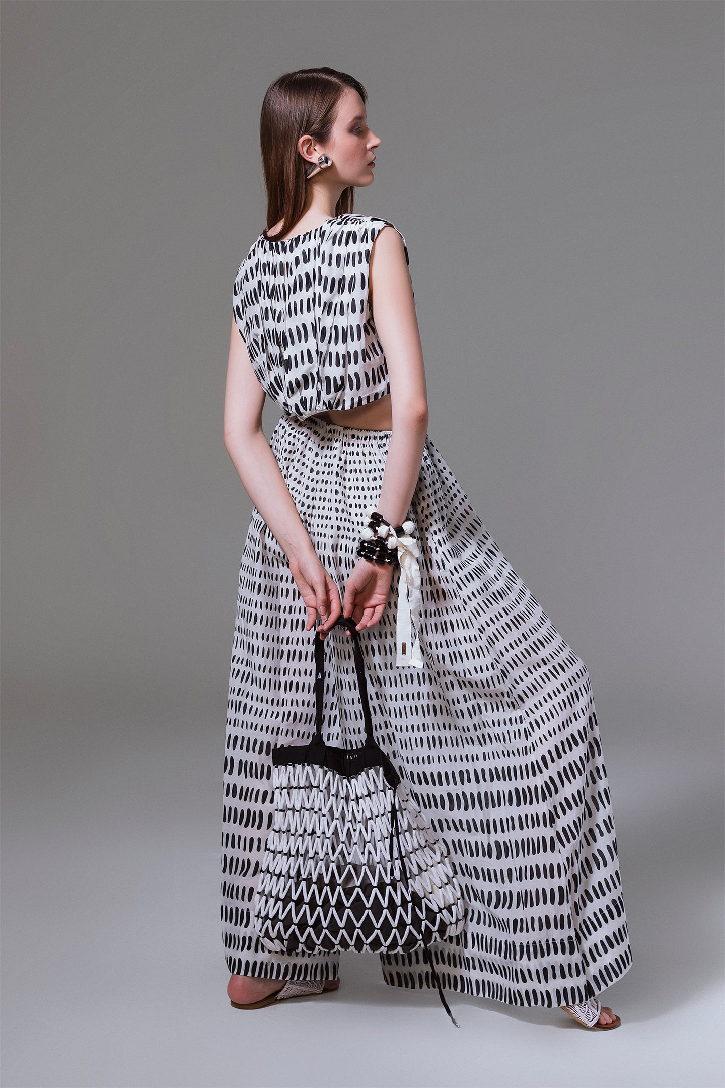 Mette Pants bring bold volume and effortless comfort with their wide, flowing legs. Designed with an elasticated waistband and hidden drawstring, they ensure a flexible fit and easy movement. Functional side pokets at the front seam add practicality, while the gradation stone print infuses a sense of energy and empowerment into everyday dressing. The Black-and-white theme adapt seamlessly from casual to elevated looks.
