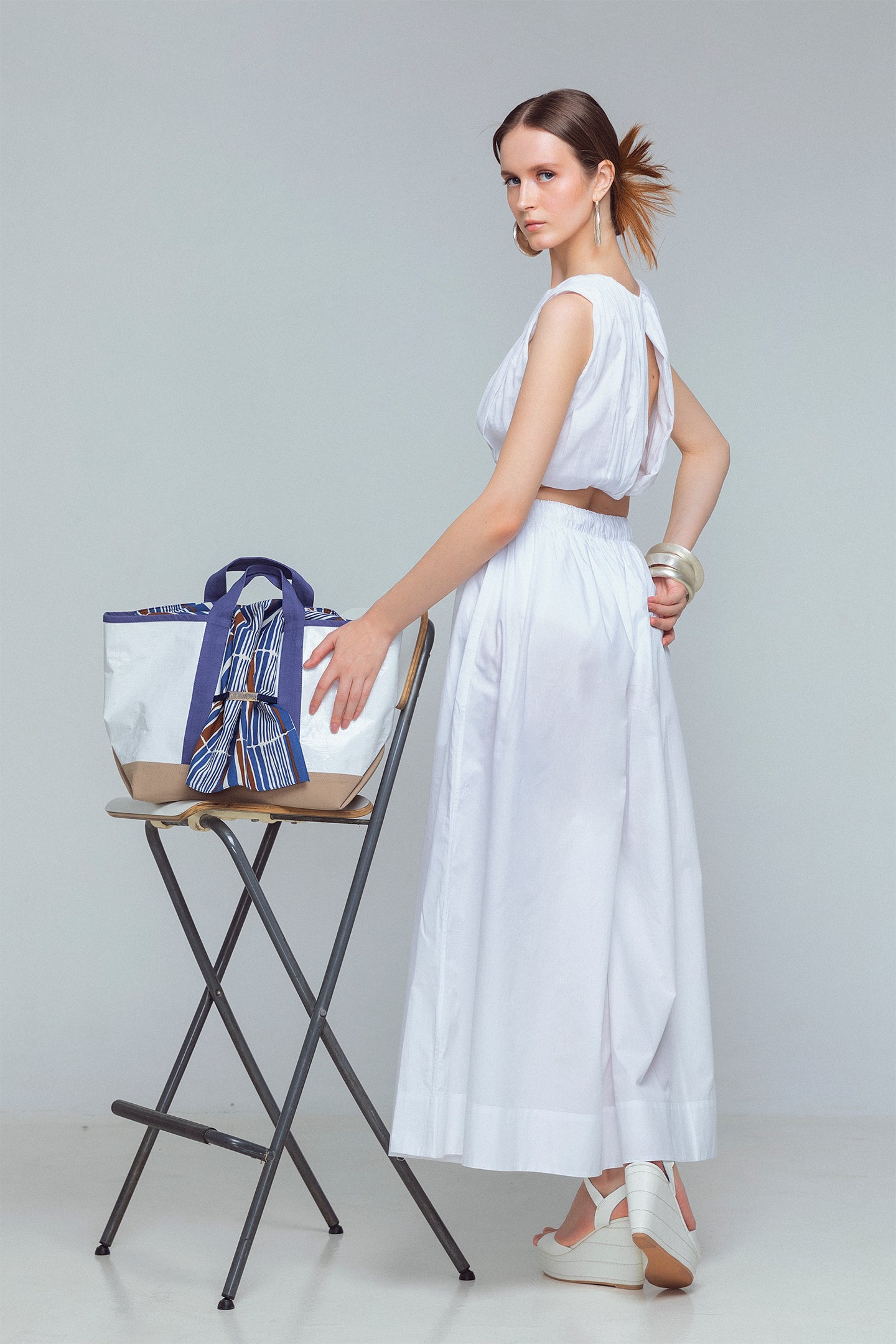 Monica Top is a modern cropped silhouette defined by sculptural pleats across the front and back. The open back fastens with discreet hook-and-eye closures, adding a unique accent. Tailored in a breathable silk-cotton blend with a soft cotton lining, it balances lightness with comfort. Refined yet playful, this versatile piece transitions seamlessly from modern daywear to contemporary evening dressing.