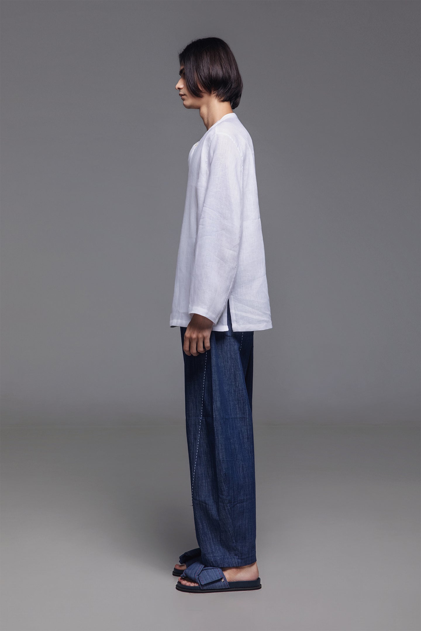 Noel Pants features a curved leg and relaxed silhouette, providing a roomy fit through the mid leg that tapers at the ankle. The elasticated waist with drawstring offers comfort, and functional pockets enhance practicality. Subtle hand-stitching adds a refined detail. This versatile piece is suitable for many occassions and pairs well with a variety of tops.