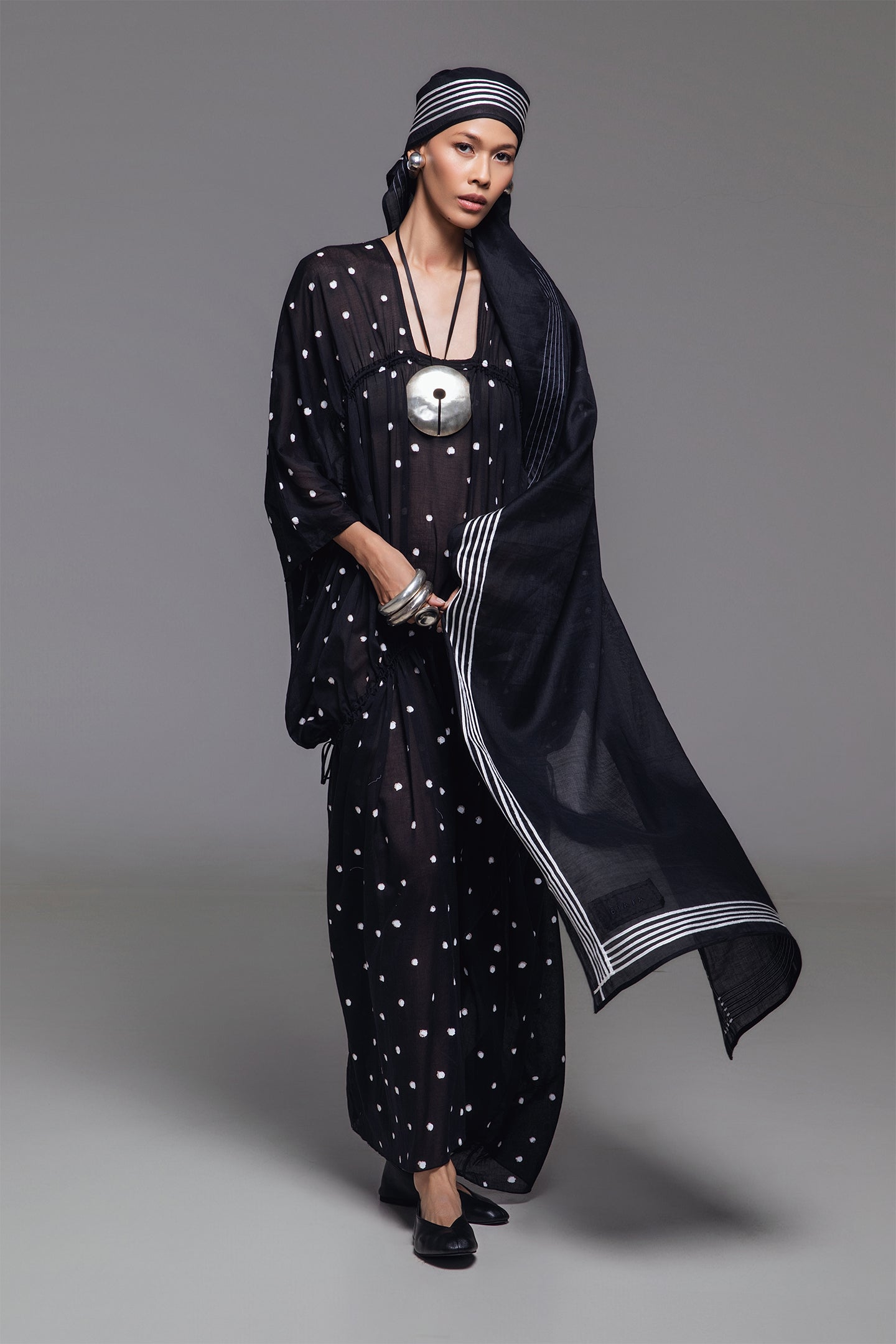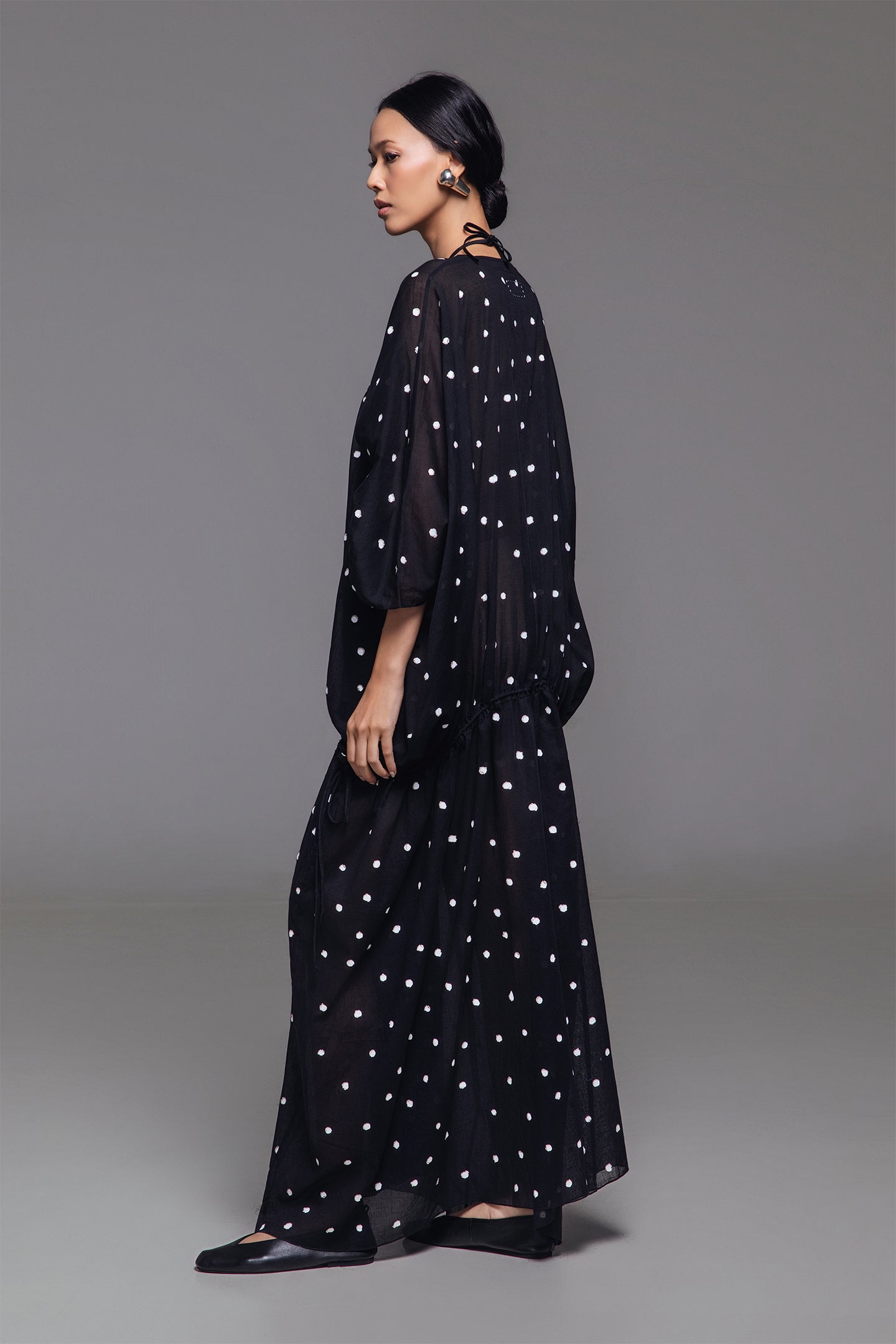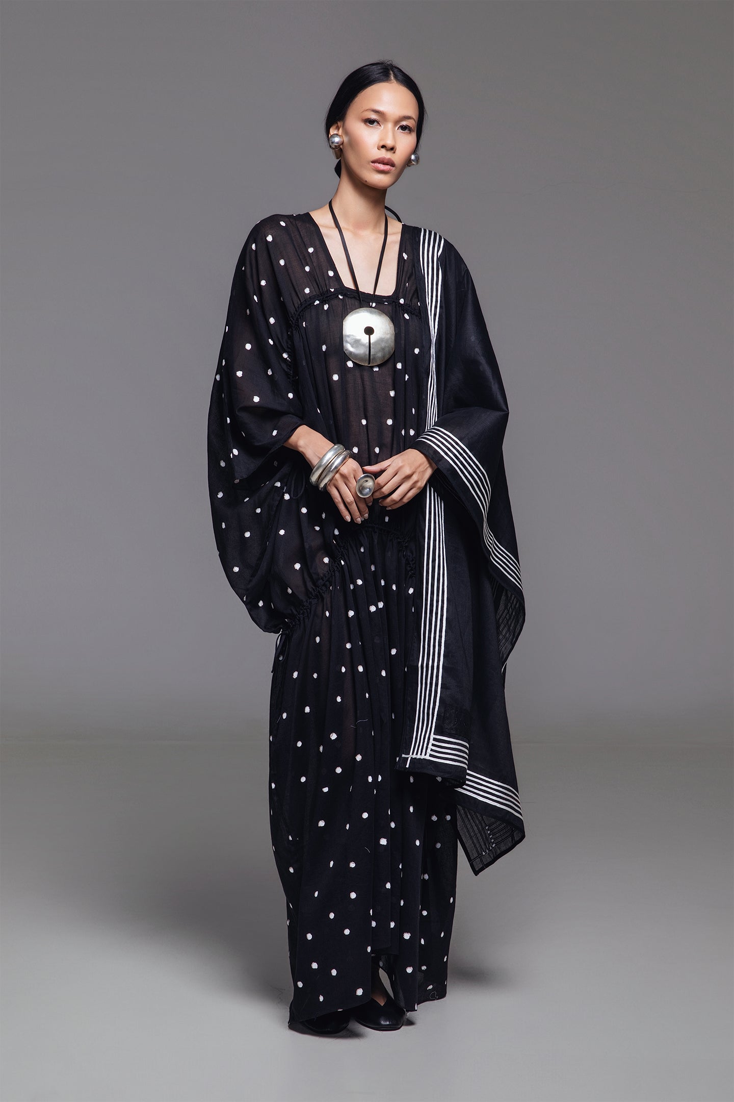 Olivine Kaftan features a relaxed, voluminous silhouette, with two drawstrings at the front allowing the fit to be adjusted from flowing to more body-contouring. The timeless polka dot print on a solid background adds classic charm, while the square neckline beautifully highlights the collarbones with understated elegance. Made from lightweight cotton, this kaftan creates a serene look that captures attention.